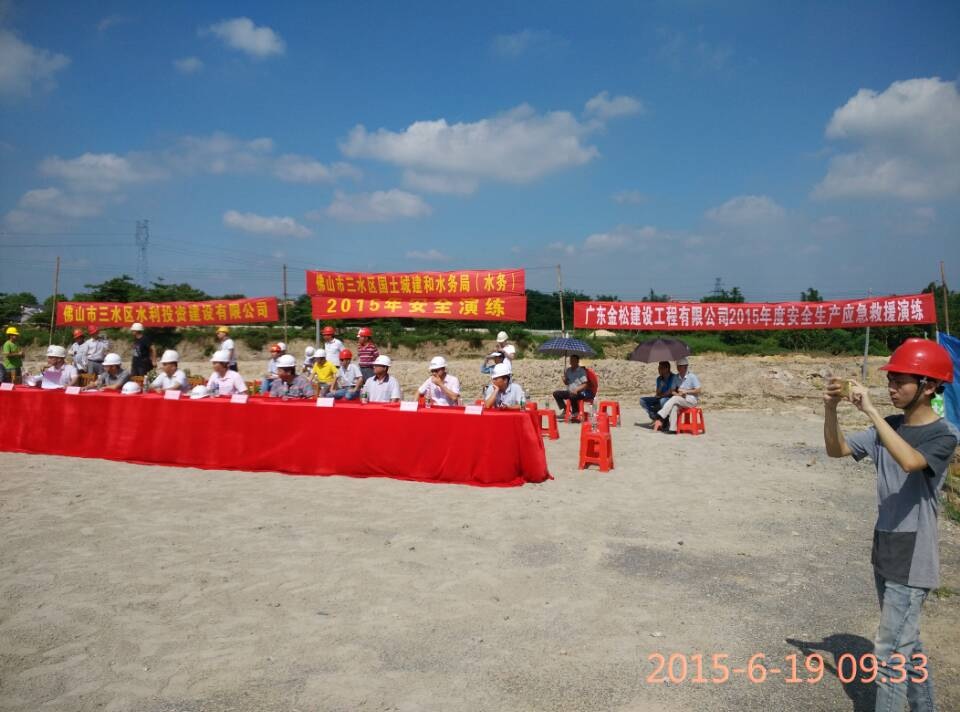 6月19日上午9點,由佛山市三水區(qū)水利投資建設(shè)有限公司、佛山市三水區(qū)國土城建和水務(wù)局主辦,廣東金松建設(shè)工程有限公司及其他多家施工企業(yè)共同參與的建筑施工現(xiàn)場安全生產(chǎn)事故應(yīng)急綜合演練在三水區(qū)樂平涌中段工地舉行。演練項目分為消防應(yīng)急救援、觸電應(yīng)急救援、深基坑塌方應(yīng)急救援、食物中毒應(yīng)急救援、火災(zāi)事故。在演練過程中,工地現(xiàn)場發(fā)生模擬事故后,立即啟動事故應(yīng)急預(yù)案,自行迅速組織現(xiàn)場救援,按既定計劃有序開展救援活動。整個演練過程組織有序、開展得力,演練取得了圓滿成功。